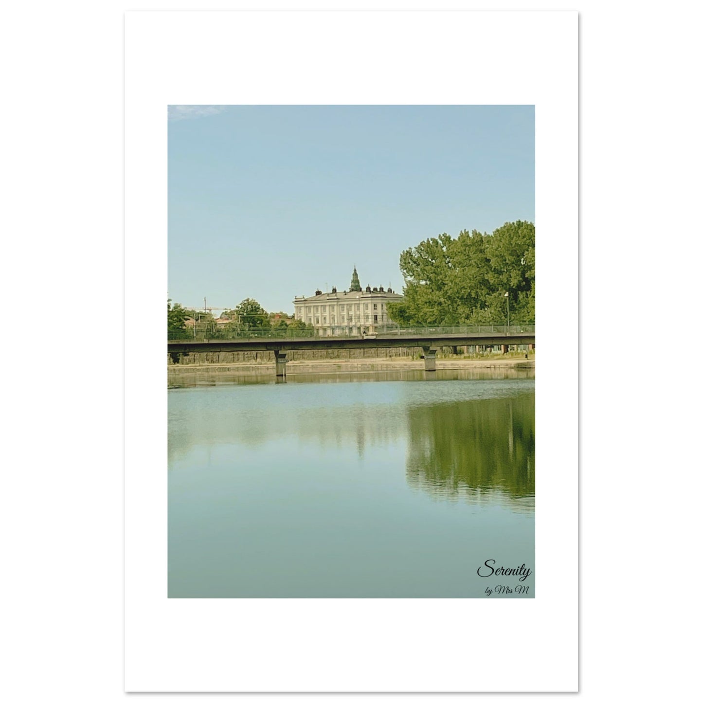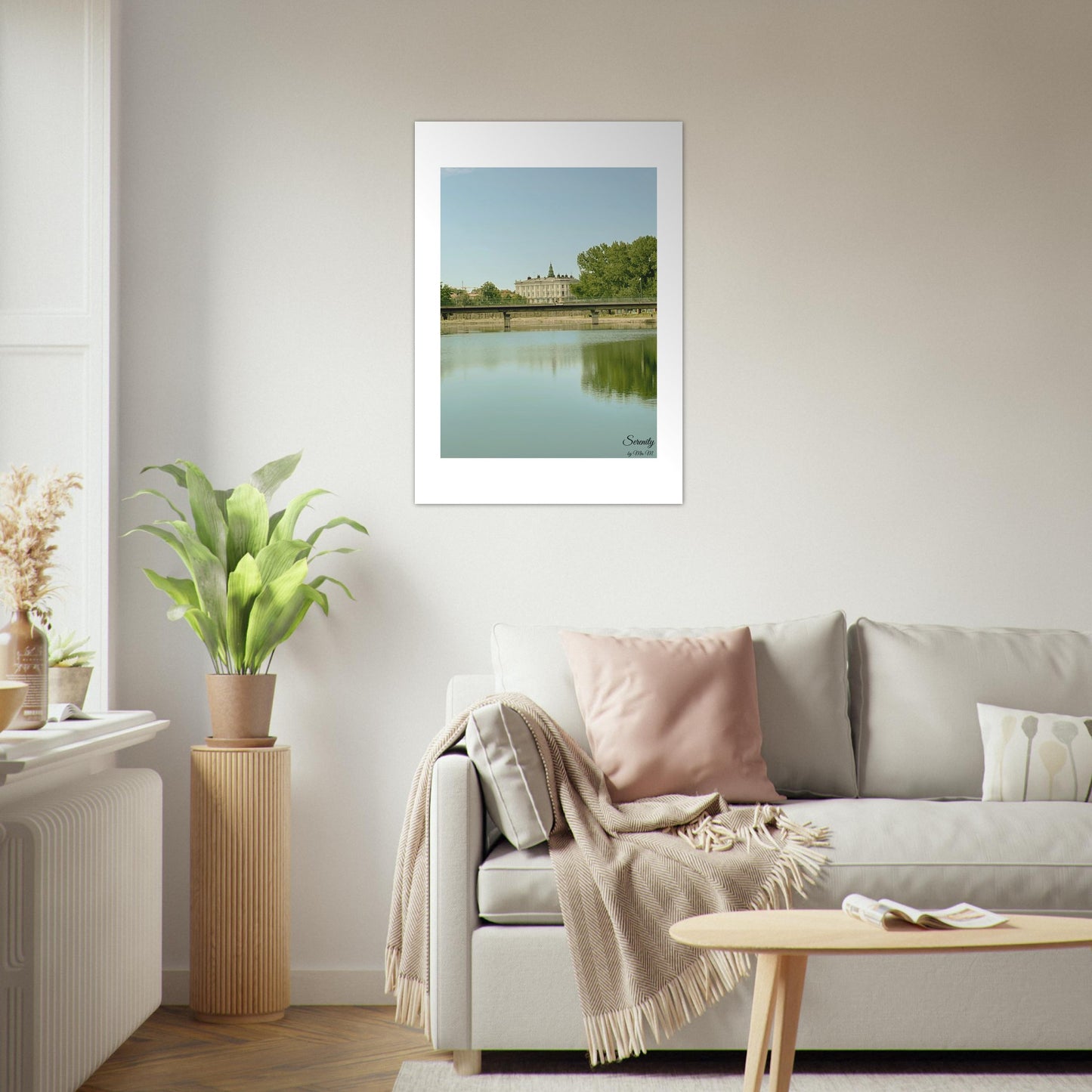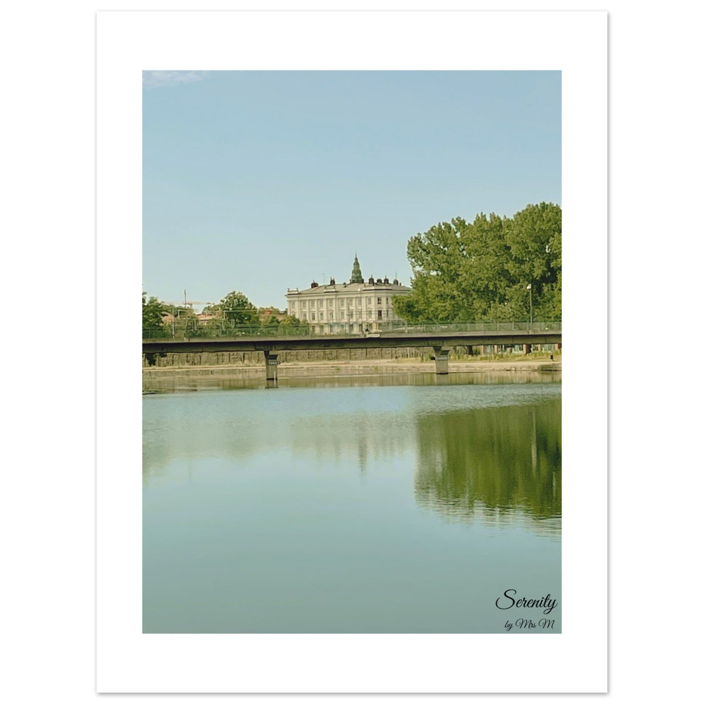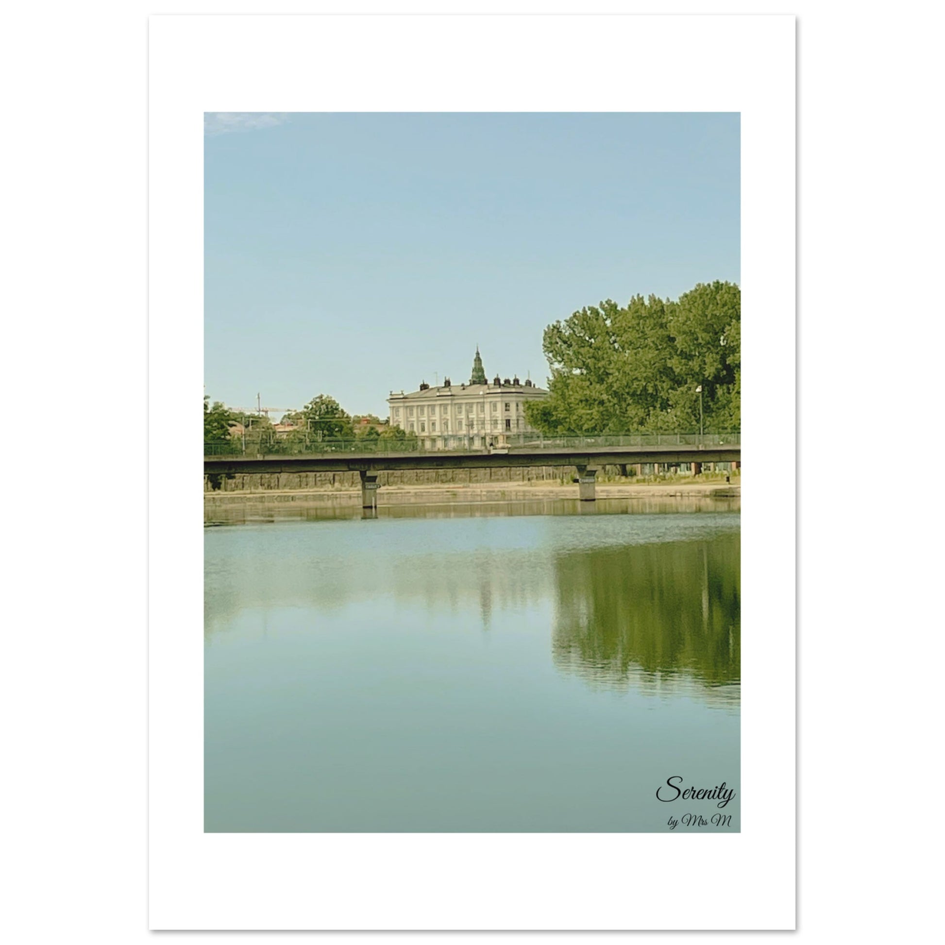 Immerse yourself in the calming essence of 'Serenity by Mrs. M,' a captivating poster that brings the peaceful charm of a European riverside cityscape right into your home. With its serene blue skies, lush green trees, and the elegant reflection of grand architecture on tranquil waters, this print evokes a sense of calm and classic beauty. It's the perfect accent to create a soothing atmosphere in any room, offering a daily escape to a picturesque, sun-drenched scene.