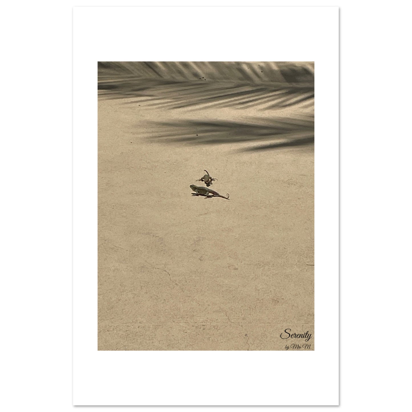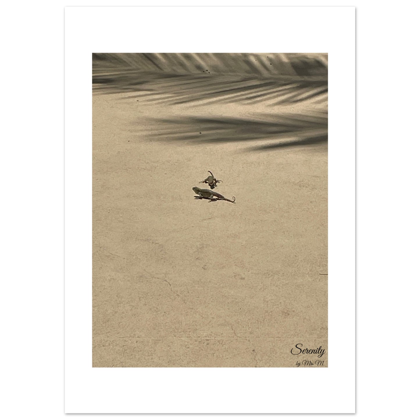 Immerse yourself in the tranquil dance of nature with our 'Serenity' poster, capturing a moment of quiet harmony between two lizards under dappled light. The muted, earthy tones and subtle shadows create a calming, contemplative mood, perfect for bringing a touch of peaceful wilderness into your home or office. This unique piece, signed 'Serenity by Mrs. M,' invites a sense of calm and wonder, encouraging you to pause and appreciate the small, beautiful interactions of the natural world.