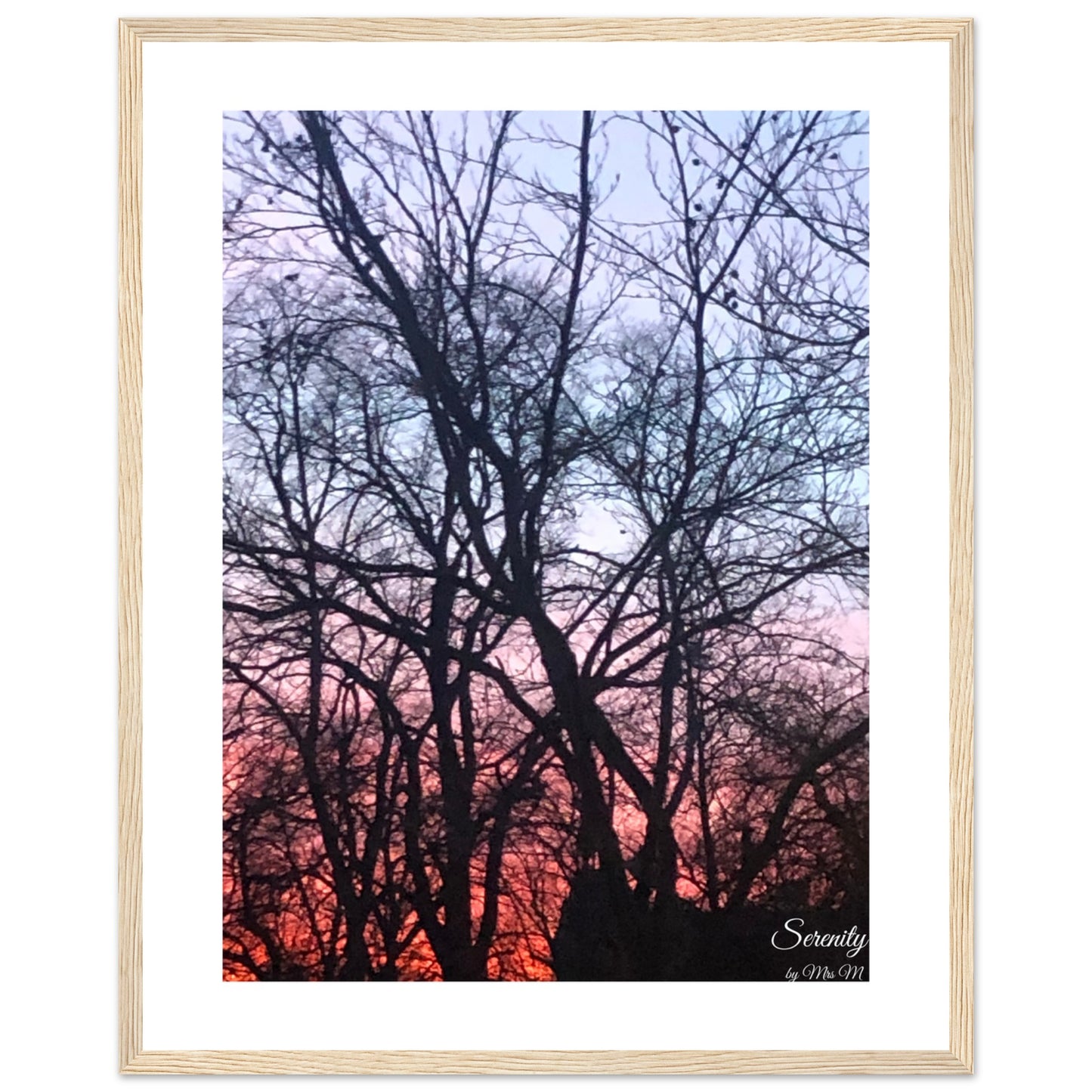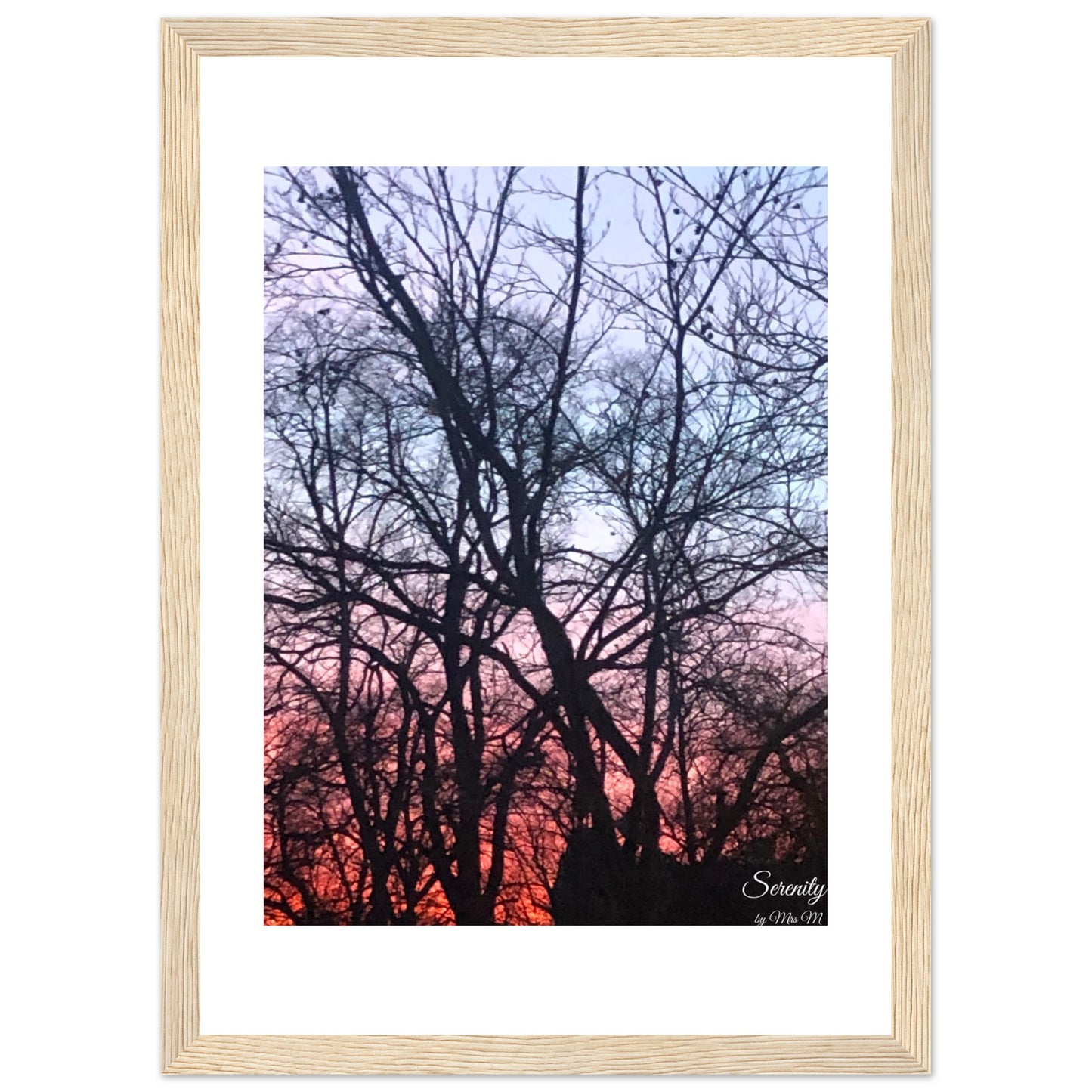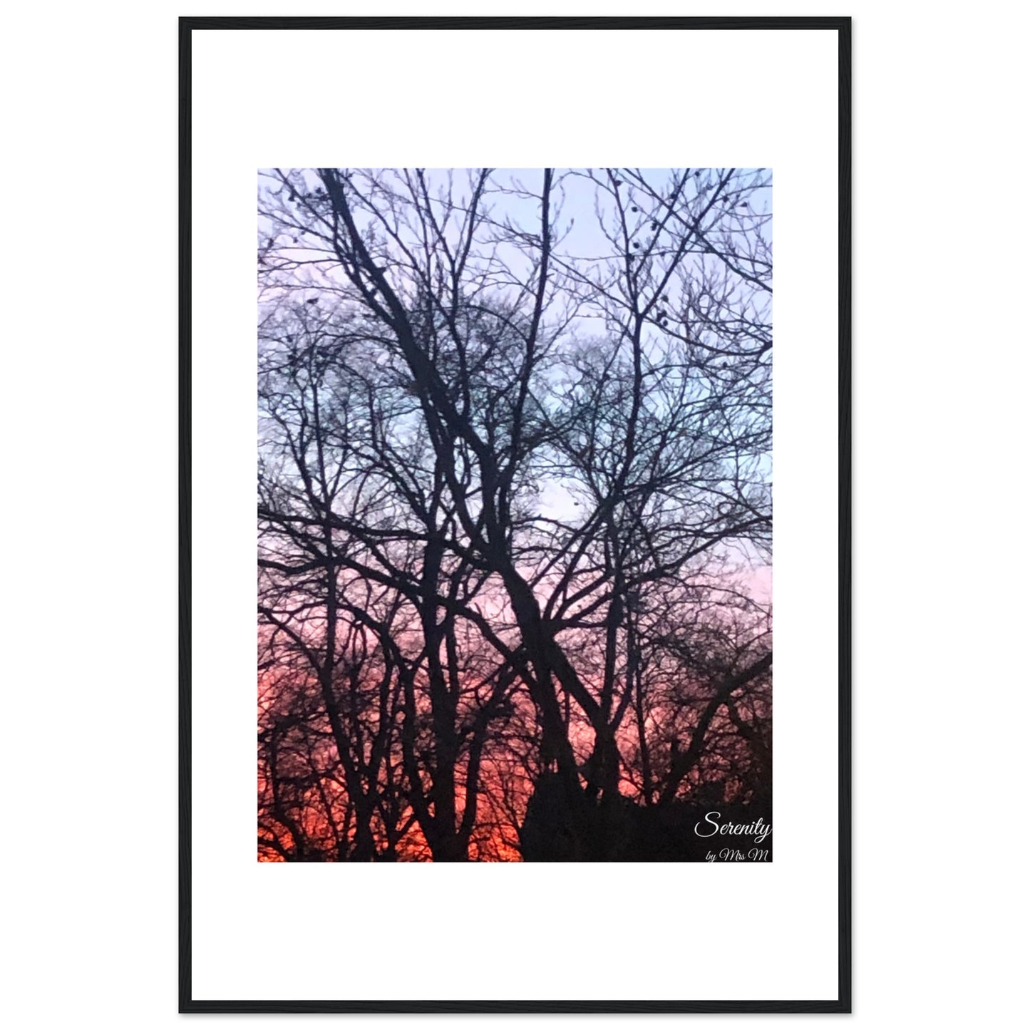 Bring the tranquil beauty of a breathtaking sunset into your home with our "Serenity Sunset Silhouettes" framed poster. This stunning piece captures the peaceful transition of day to night, with vibrant hues of orange and pink fading into a soft twilight blue, silhouetted by the intricate branches of trees. It's more than just a picture; it’s an invitation to pause, breathe, and find your own moment of calm.