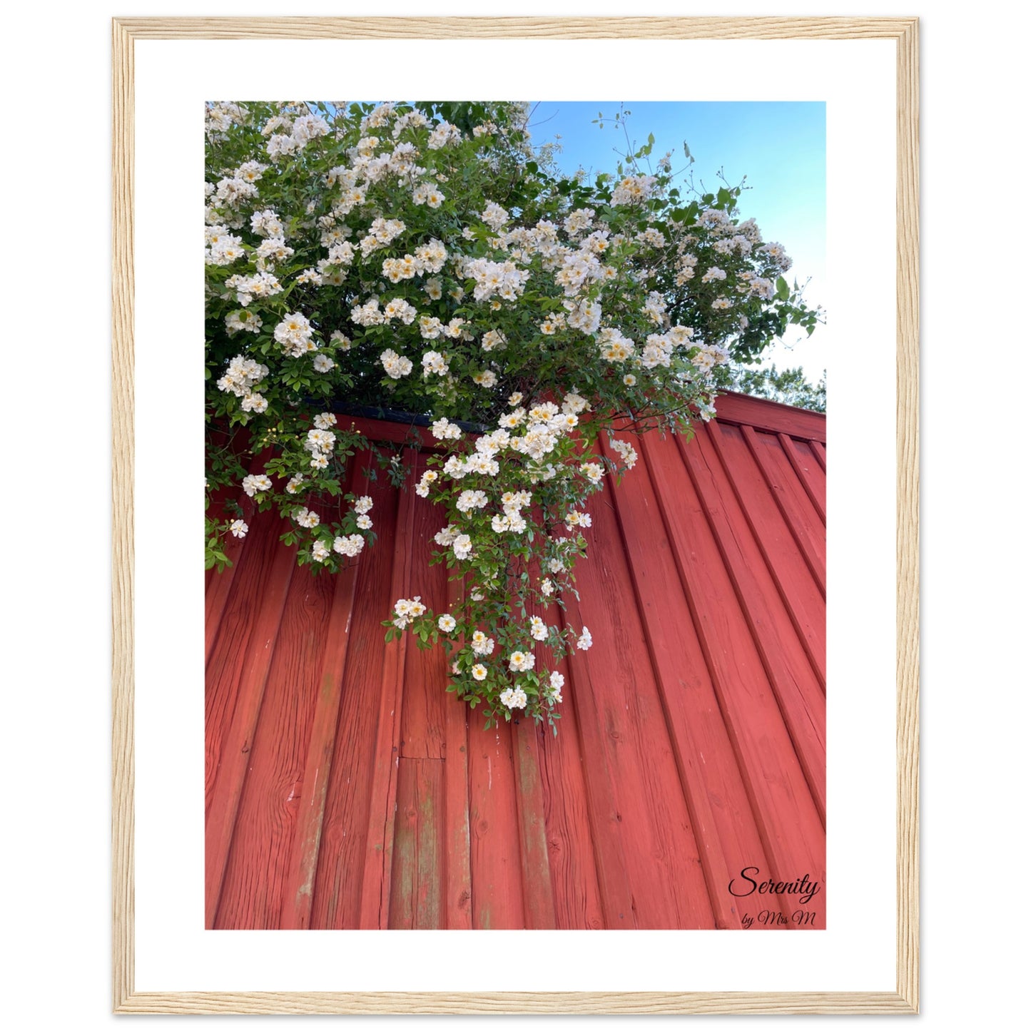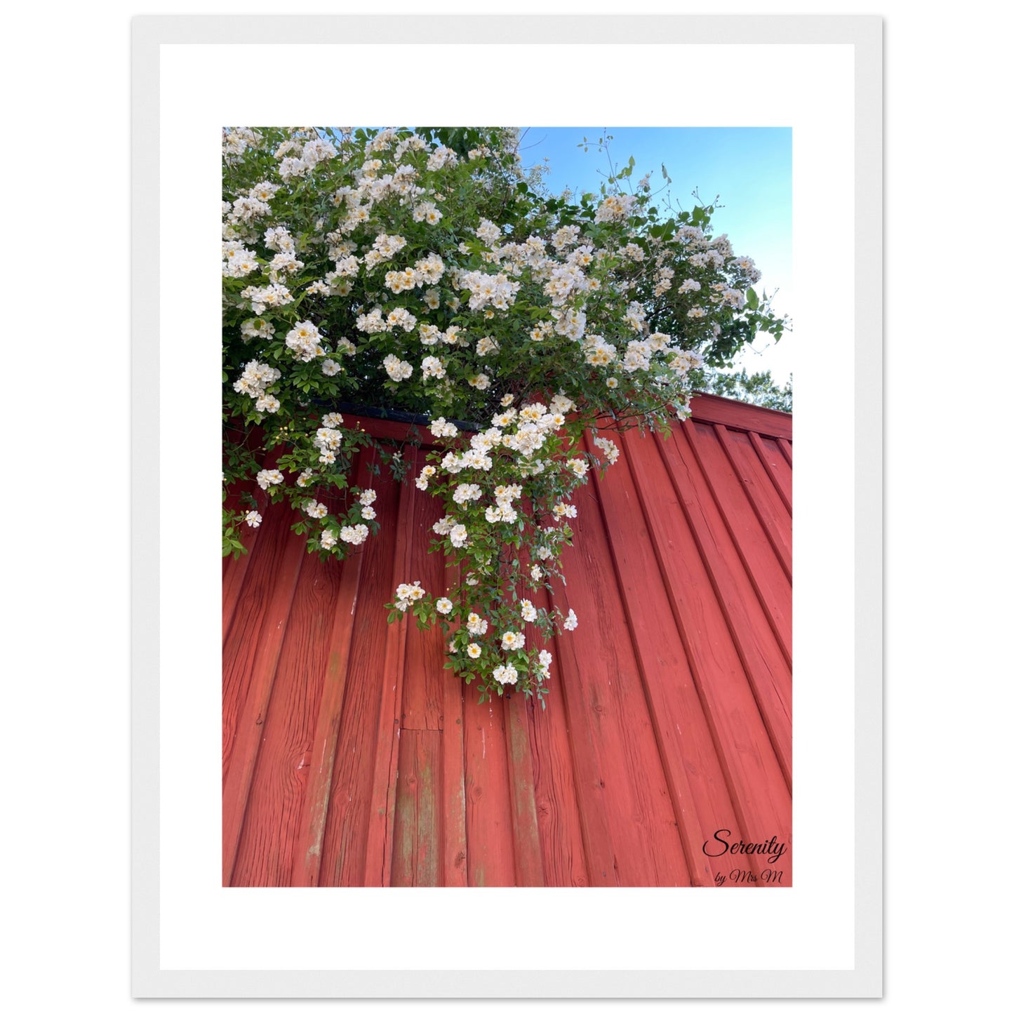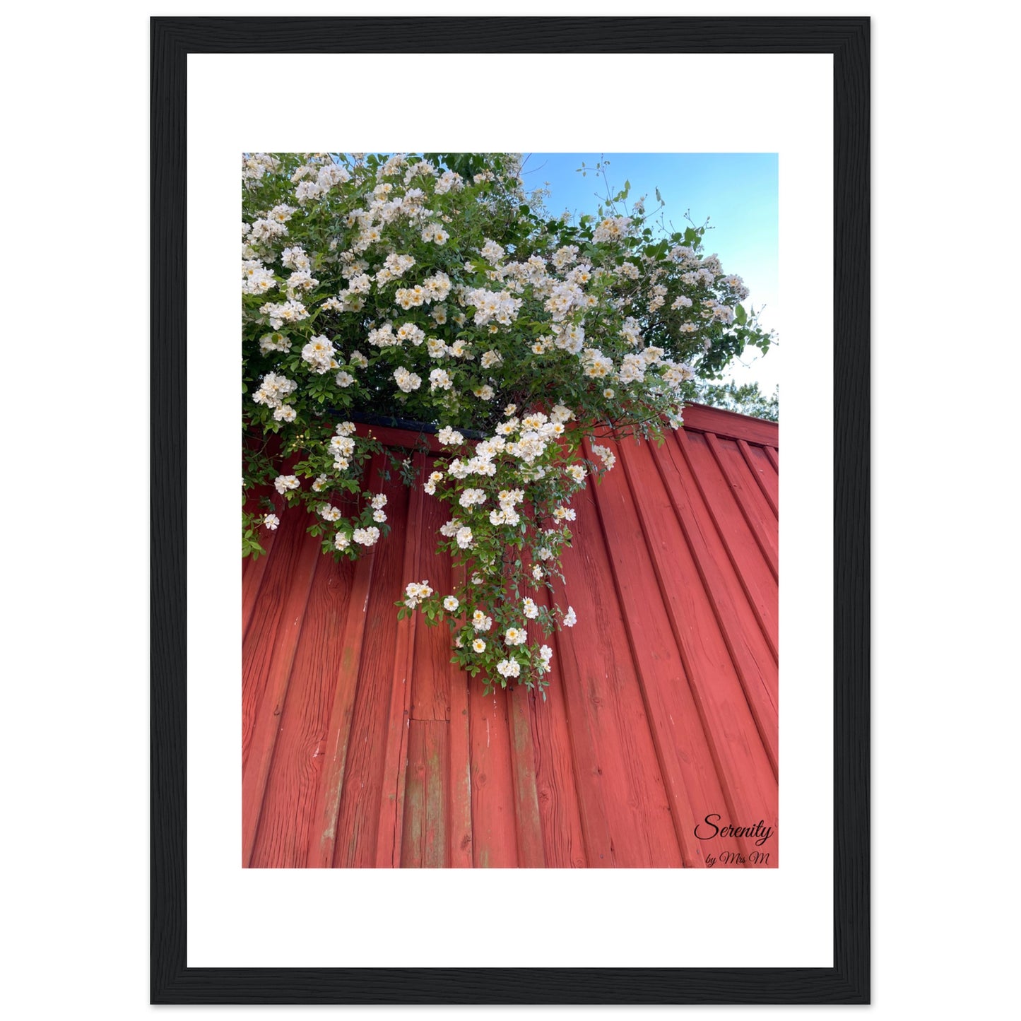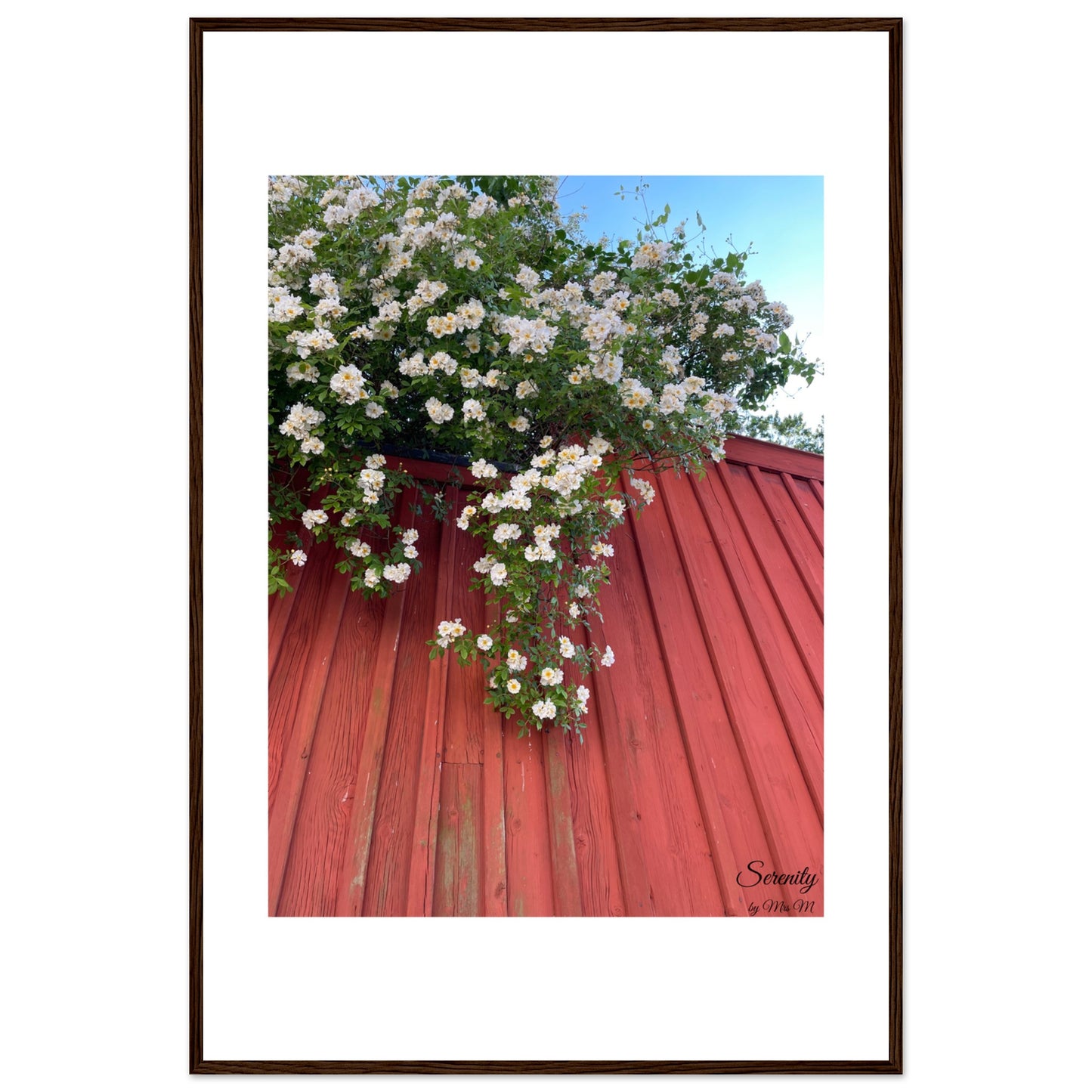 Bring the peaceful elegance of blooming white roses against a rustic red backdrop into your home with our "Serenity's Bloom" framed poster. This enchanting piece captures the essence of a serene garden moment, perfect for adding a touch of natural beauty and calming vibes to any room. The vibrant contrast and delicate floral details make it an instant focal point, inviting tranquility and rustic charm.