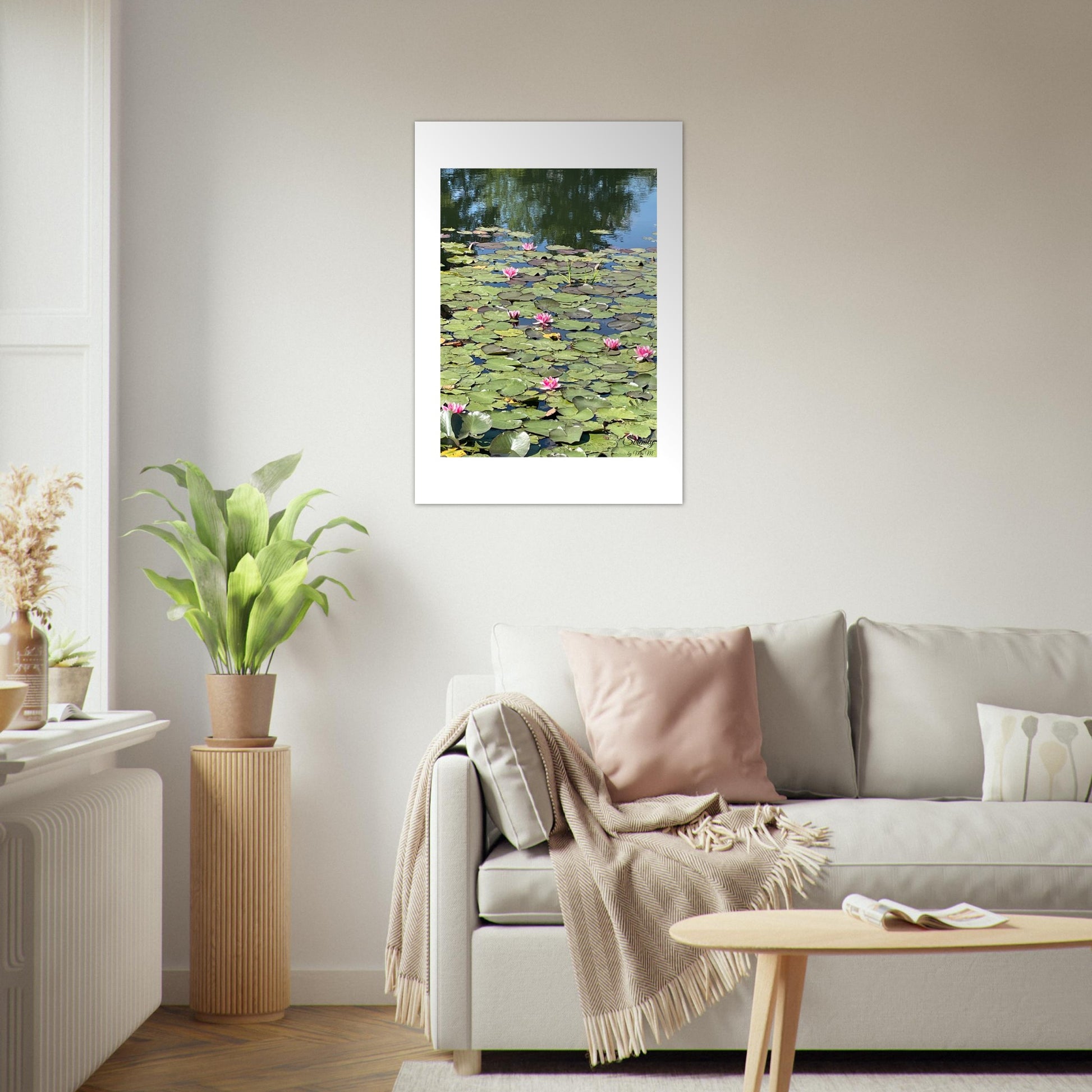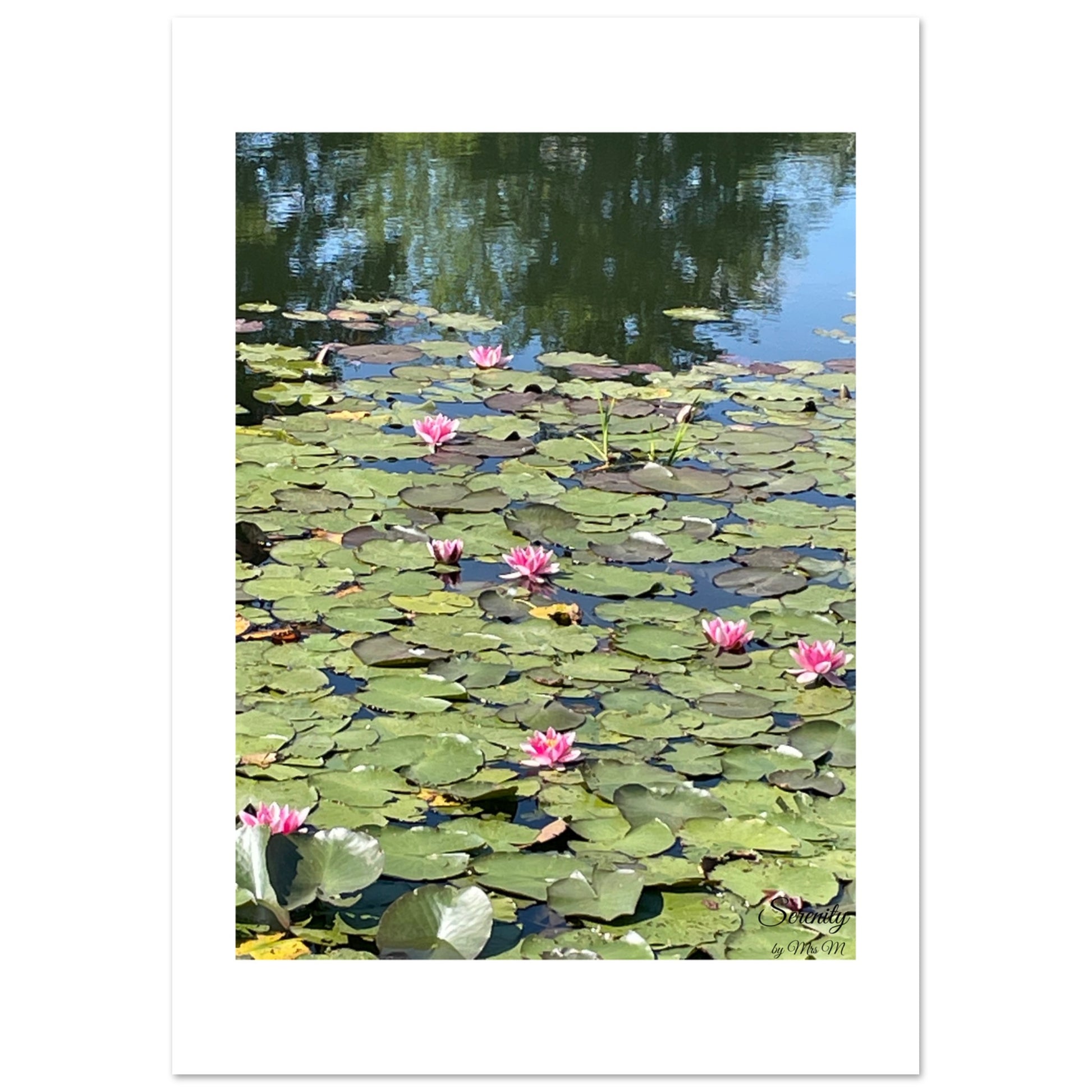Immerse your space in the tranquil beauty of nature with our Water Lilies Pond Art Print. This serene poster captures the delicate elegance of vibrant pink water lilies floating peacefully amidst lush green lily pads, reflecting the calm blue sky above. It's an instant escape to a moment of quiet reflection, perfect for bringing a touch of natural harmony and vibrant color to any room.