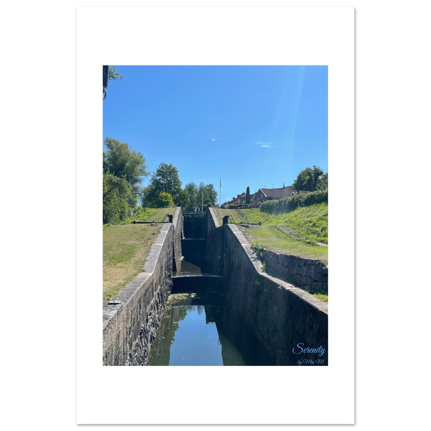 Bring the peaceful ambiance of a sun-drenched canal lock into your home with our "Serenity" poster. This captivating artwork, featuring calm waters and the timeless architecture of a water lock under a brilliant blue sky, evokes a sense of quietude and escape. The vibrant greens of nature contrasting with the sturdy stone walls create a picturesque scene perfect for adding a touch of serene beauty to any room.