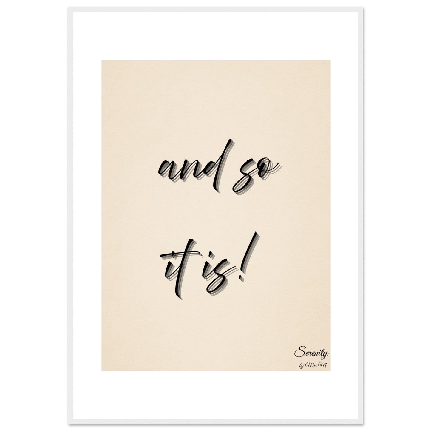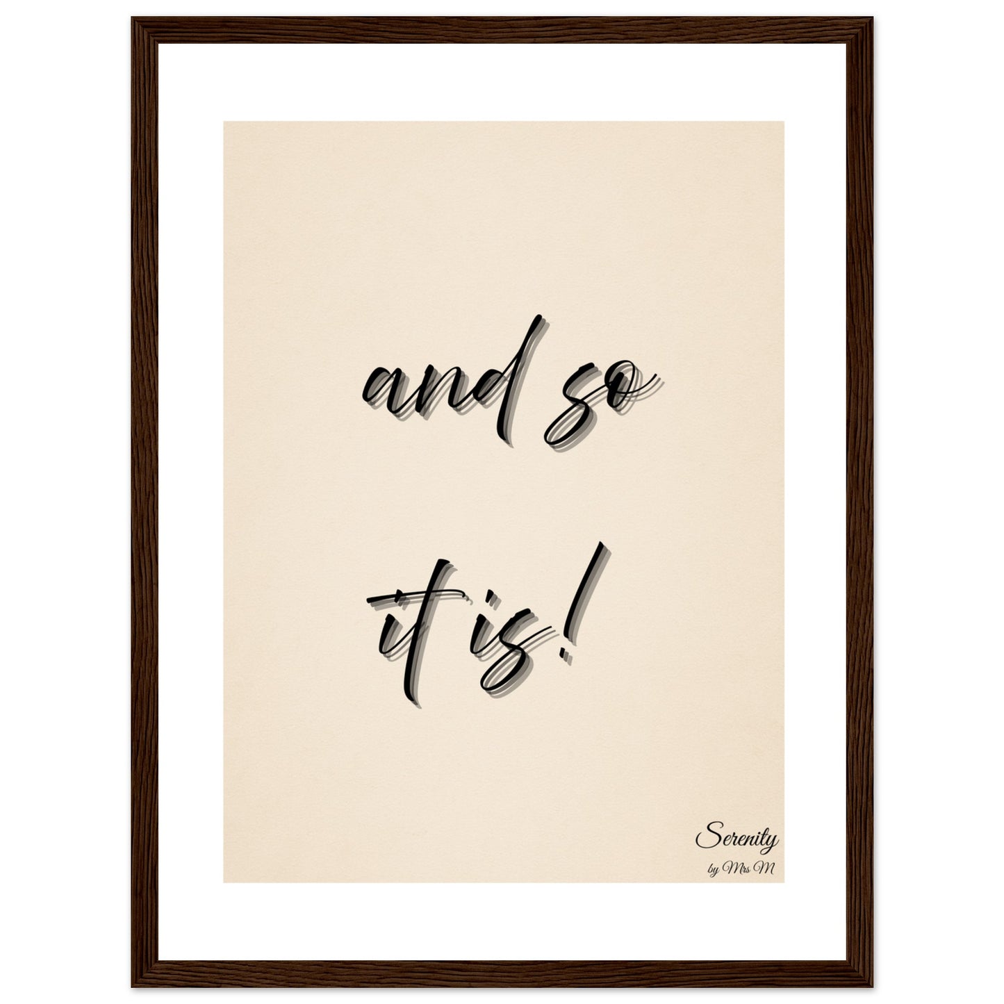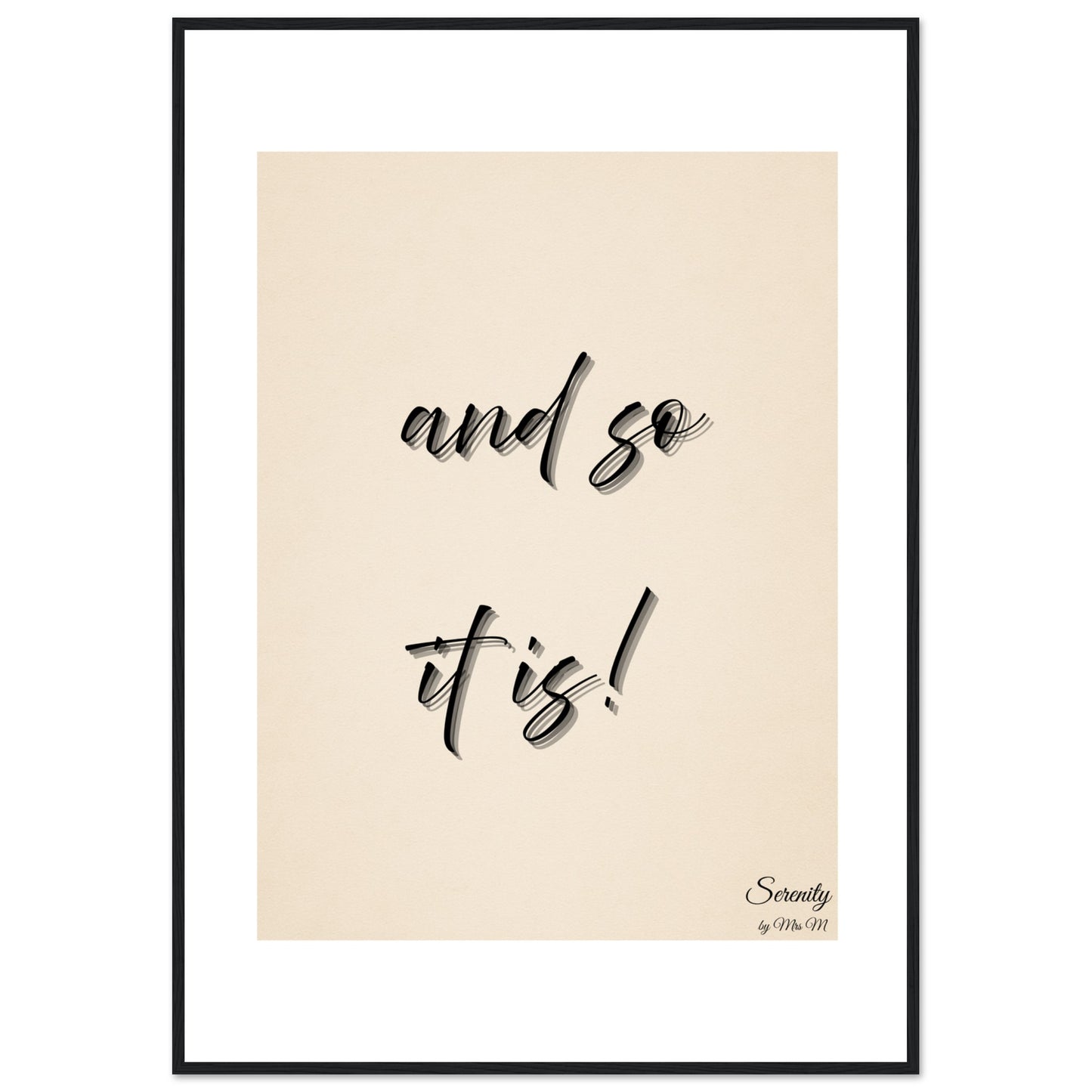 Embrace a moment of calm affirmation with our 'and so it is!' framed poster. Featuring elegant script on a serene, textured background, this piece from the 'Serenity by Mrs M' collection offers a gentle yet powerful daily reminder to trust in the journey. It's the perfect accent for any space needing a touch of peace and positive energy.