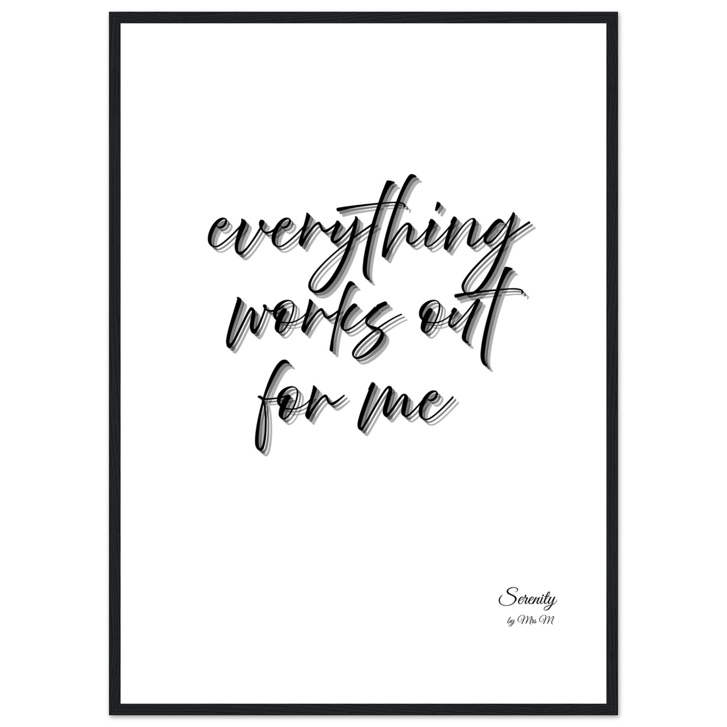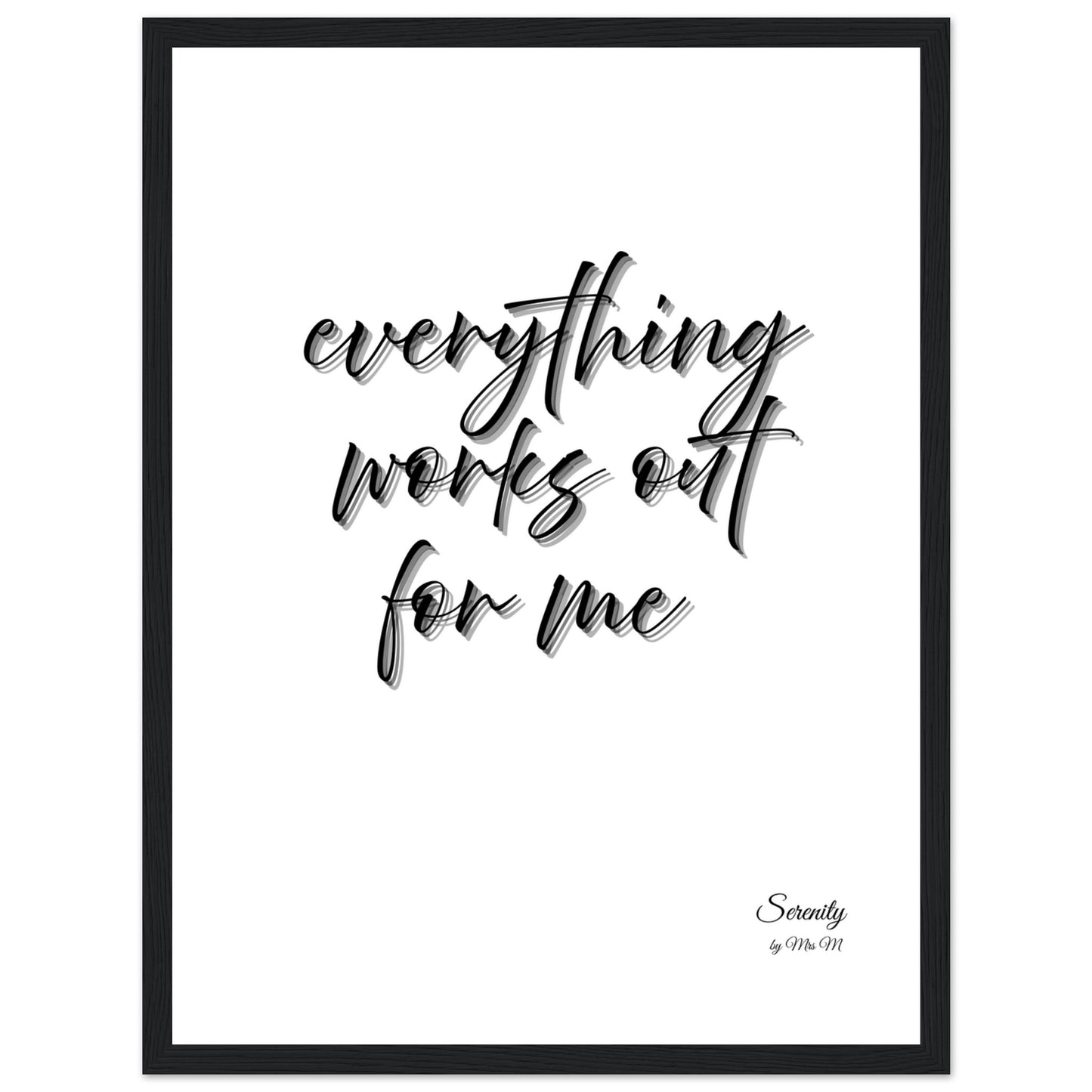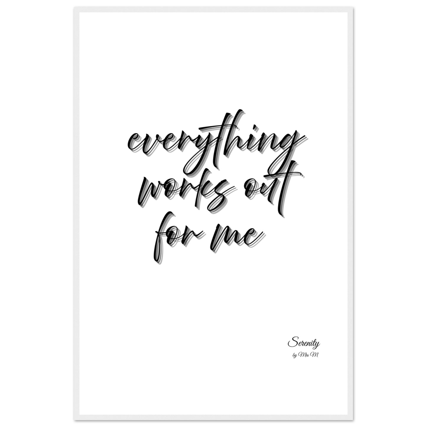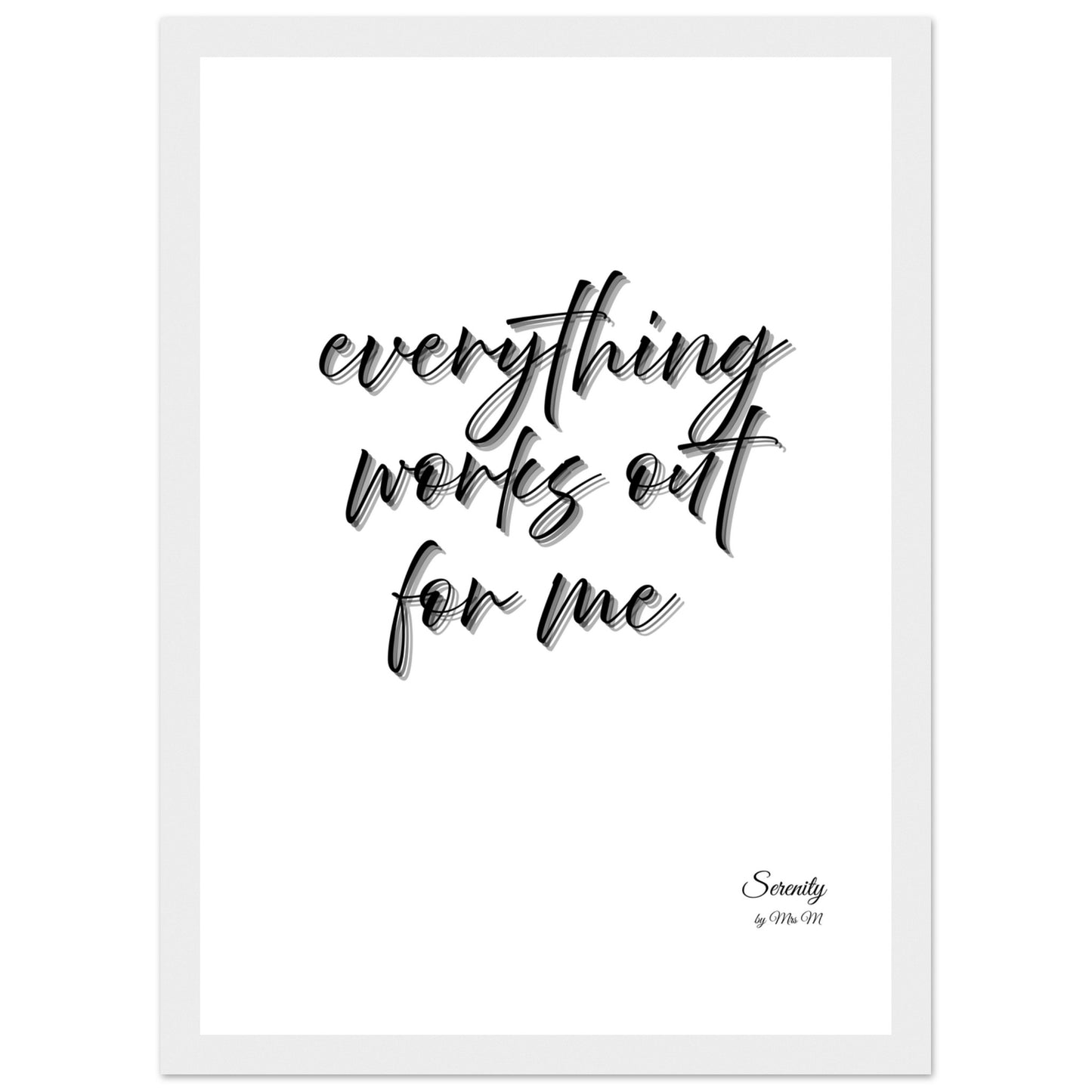 Invite positive affirmations into your space with our 'everything works out' framed poster. This elegant, minimalist design, featuring a graceful script with a subtle shadow effect, brings a calming yet powerful message to any room. Perfect for a home office, bedroom, or living area, it serves as a daily reminder of serenity and optimism, curated to enhance your environment and mindset.