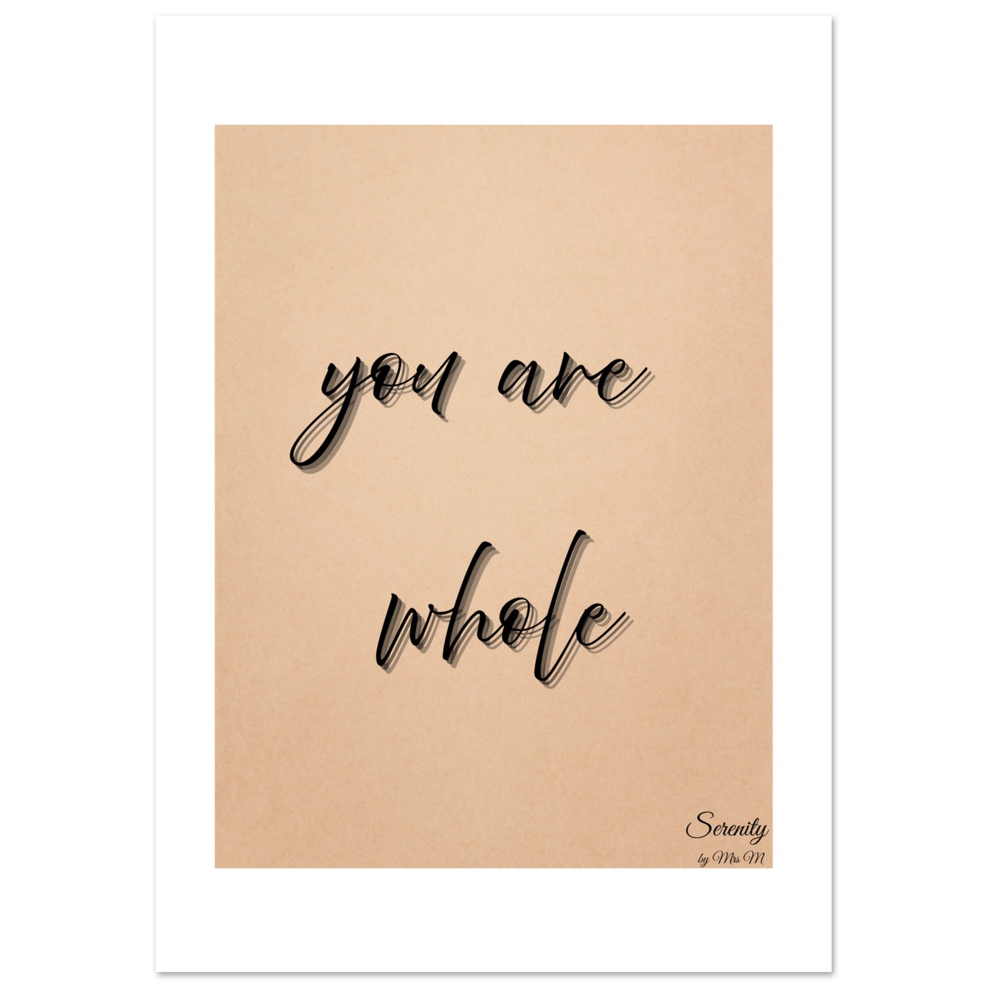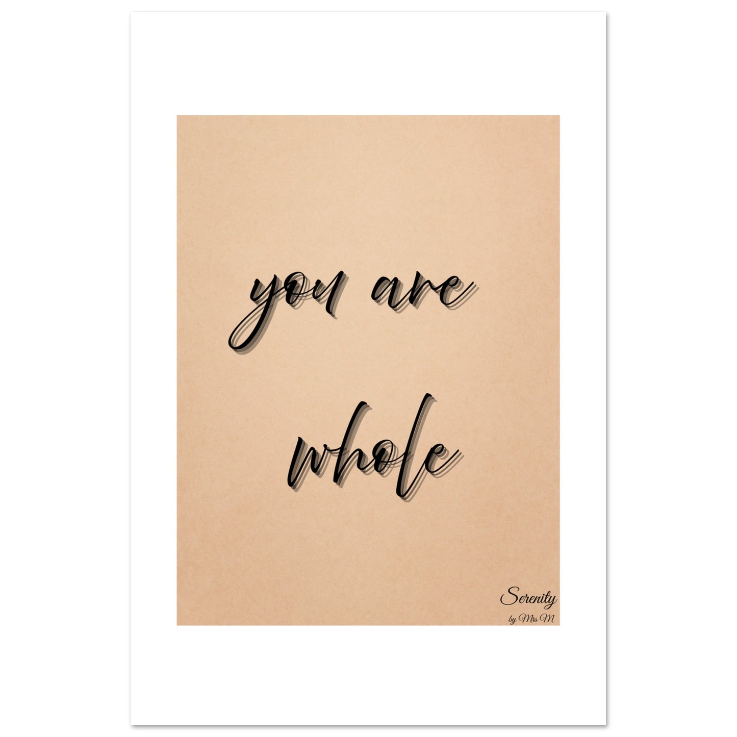 Embrace self-love and inner peace with our 'you are whole' Serenity poster, designed to be a daily reminder of your inherent worth. This beautifully scripted artwork, set against a calming, natural-toned background, offers a touch of elegant inspiration to any room. It's more than just a poster; it's a statement of tranquility and affirmation, perfect for creating a serene sanctuary in your home or office.